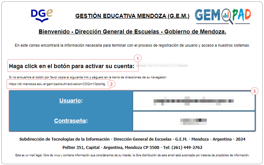 El sistema le enviará un “e-mail de Activación de Cuenta” desde la dirección dge-sistemas@mendoza.edu.ar cuyo Asunto será: “Creación de cuenta”.