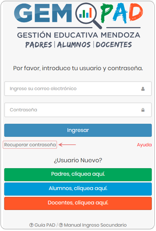 Ingresar a la Plataforma G.E.I. con su nuevo usuario ("dirección de e-mail") y su nueva contraseña.