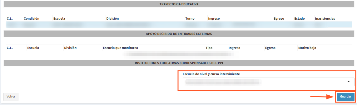 Dependiendo del Docente que esté cargando, de Nivel o de la Modalidad Especial, deberá elegir el campo “Escuela de nivel y curso interviniente” o “Escuela de la modalidad y curso interviniente” con la que trabajó corresponsablemente. Puntualmente lo que se determina en este apartado son las Escuelas con la que se trabajó el PPI. En el caso de que el estudiante reciba Apoyo externo, "no" deberá "ni" podrá elegir una escuela de la Modalidad Especial.